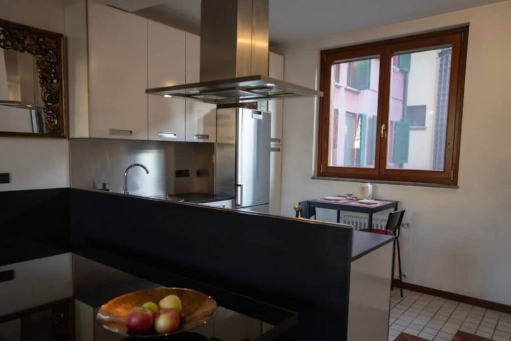 Entering the apartment you find a large living room with TV, sofa and pouf both convertible into two single beds, a large dining table that can also be used to work or study and a beautiful open kitchen where we find a second tall table perfect for breakfast.