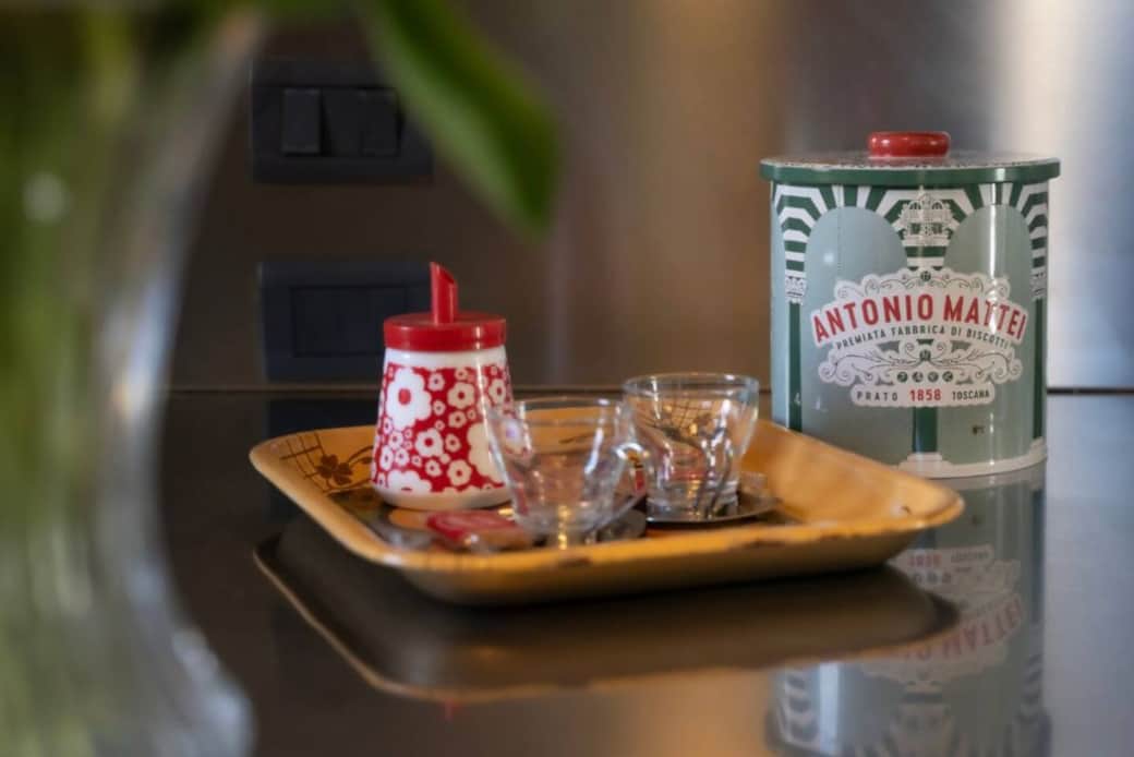 Angolo cucina con comodo bancone design, induzione, macchina Nespresso e frigorifero Smeg.